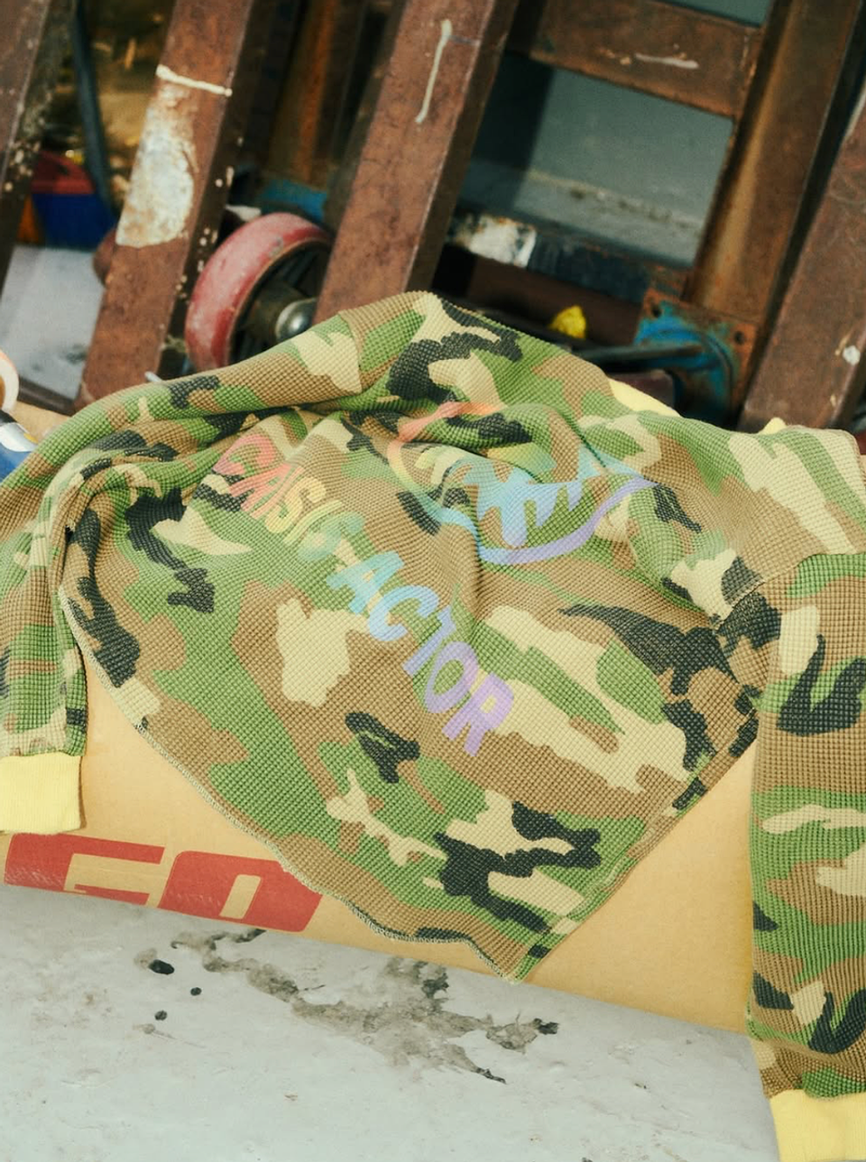 as seen on mona tougaard, the thermals feature classic military camo, contrasted by bold colored graphic iconography.